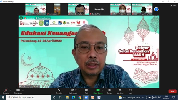 Dalam rangka Gebyar Safari Ramadahan (GSR) 1443 H, OJK Regional 7 Sumbagsel menyelenggarakan kegiatan Edukasi Pengelolaan Keuangan Syariah dan Peluang Ekonomi Industri Halal pada tanggal 19 April 2022. Kegiatan yang dilaksanakan secara vitual tersebut bertujuan meningkatkan literasi keuangan syariah bagi Pelaku UKM serta menumbuhkan awareness terhadap potensi ekonomi halal di Sumatera Selatan. Dalam kesempatan ini, OJK bekerja sama dengan Dinas Koperasi, Usaha Kecil dan Menengah Provinsi Sumatera Selatan, PT Pegadaian Wilayah 3 Palembang dan Masyarakat Ekonomi Syariah (MES) Sumatera Selatan. Direktur Pengawasan LJK OJK Regional 7 Sumbagsel Iwan M. Ridwan dalam sambutan pembukaannya mengharapkan potensi ekonomi halal di Sumatera Selatan dapat dimanfaatkan sebesar-besarnya untuk memeratakan kesejahteraan umat. Dalam hal ini, literasi keuangan syariah memiliki peran penting dalam mendorong utilisasi produk/layanan jasa keuangan syariah sebagai suatu ekosistem yang tidak terpisahkan dengan ekonomi halal.